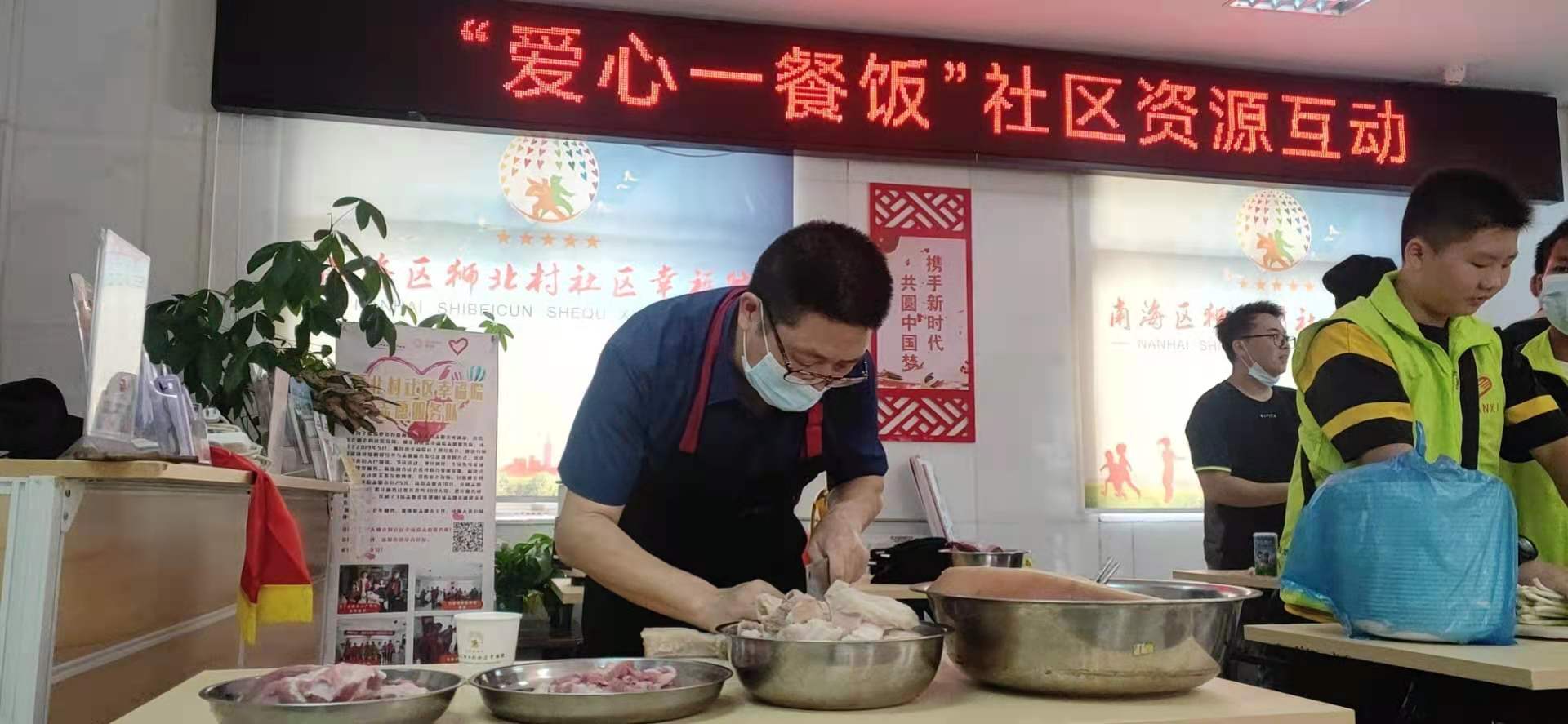一大早,志愿者们带上食材、厨具,到达狮北敬老院。给老人们准备新鲜水果和节日礼品。志愿者们一来到敬老院就各自忙碌起来。