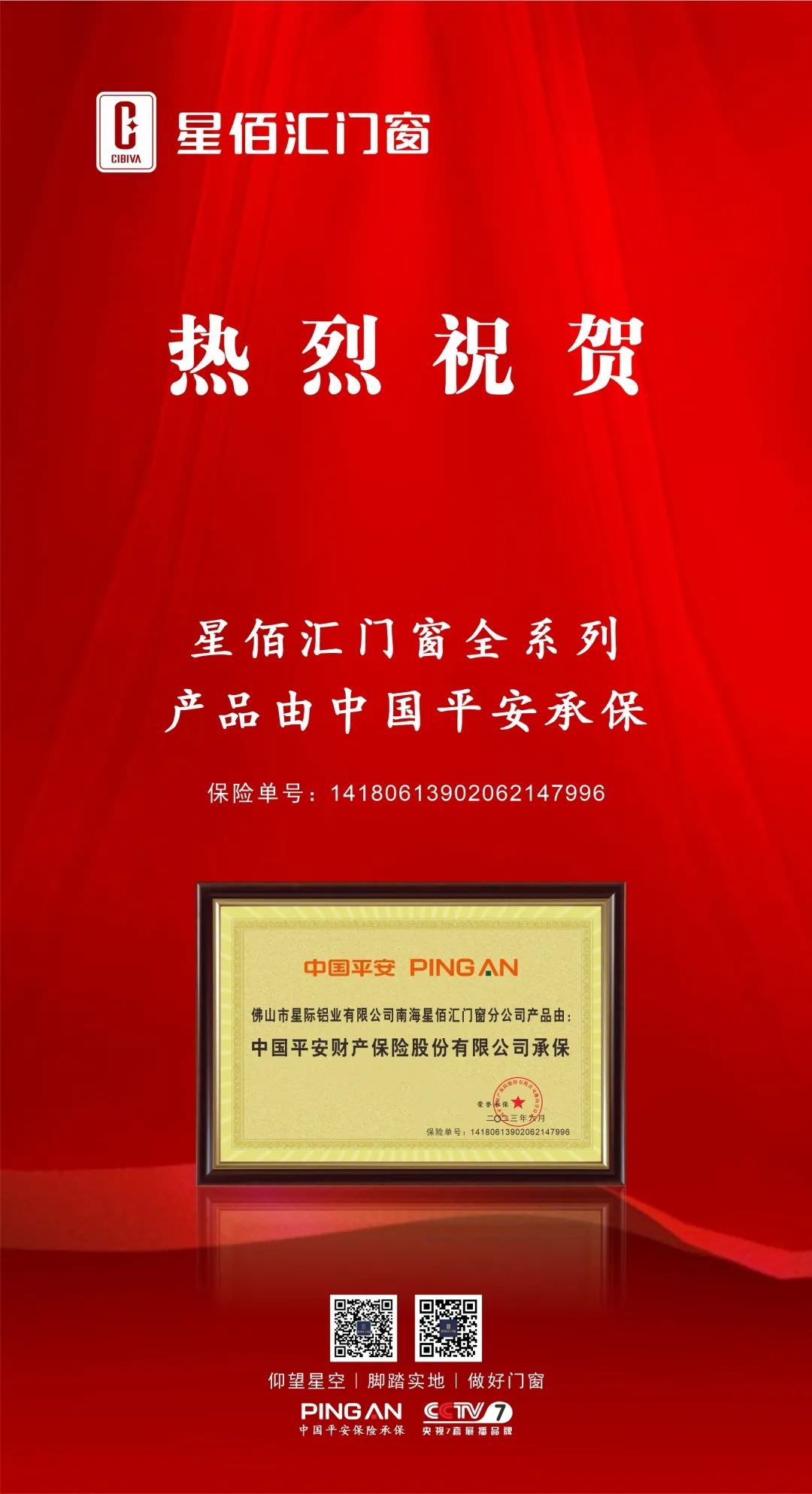 星佰汇门窗与中国平安保险达成战略合作,中国平安保险承保旗下所有门窗产品,为广大消费者提供保障。