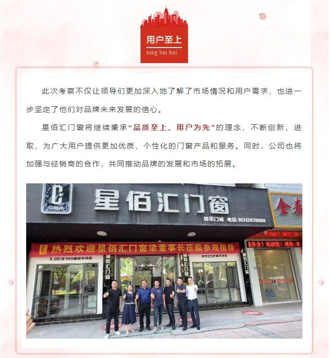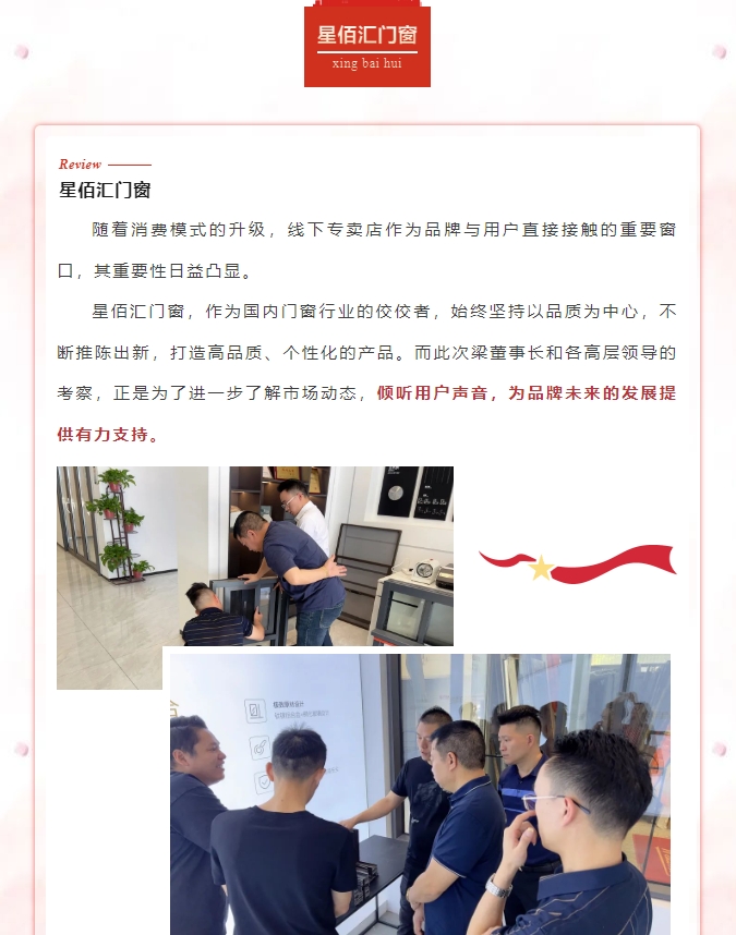 近日,星佰汇门窗总部梁董与高层领导们深入市场,亲自参观考察了旗下的线下专卖店。这不仅是一次简单的视察,更是对品牌实力与市场反应的深度检验。